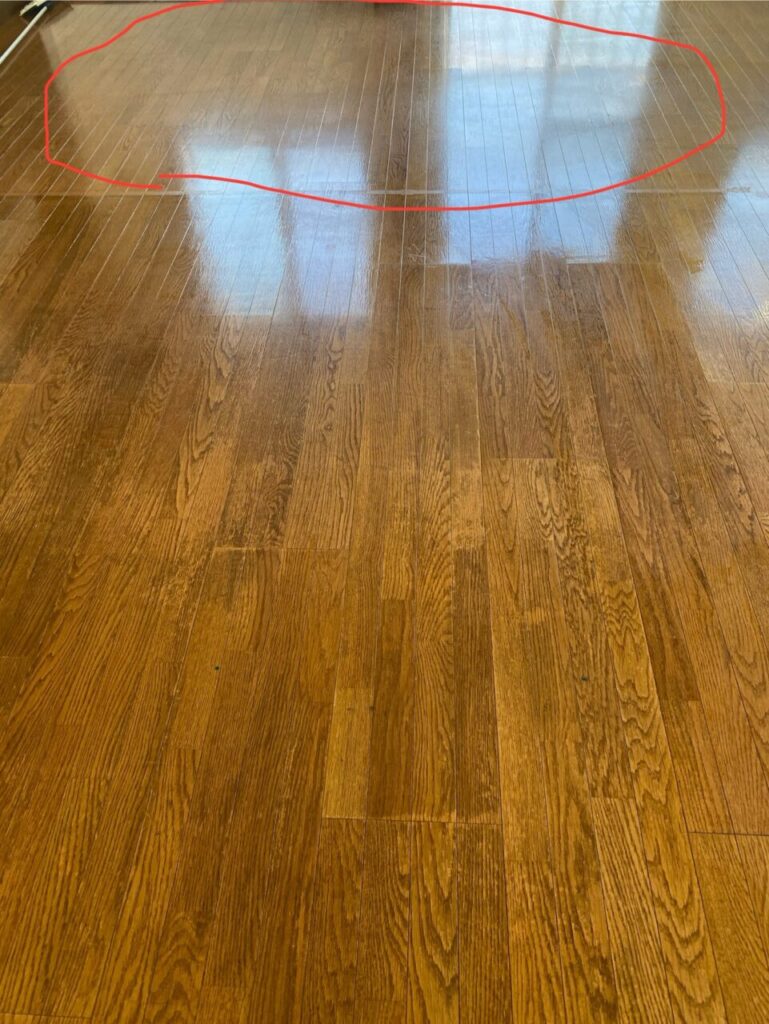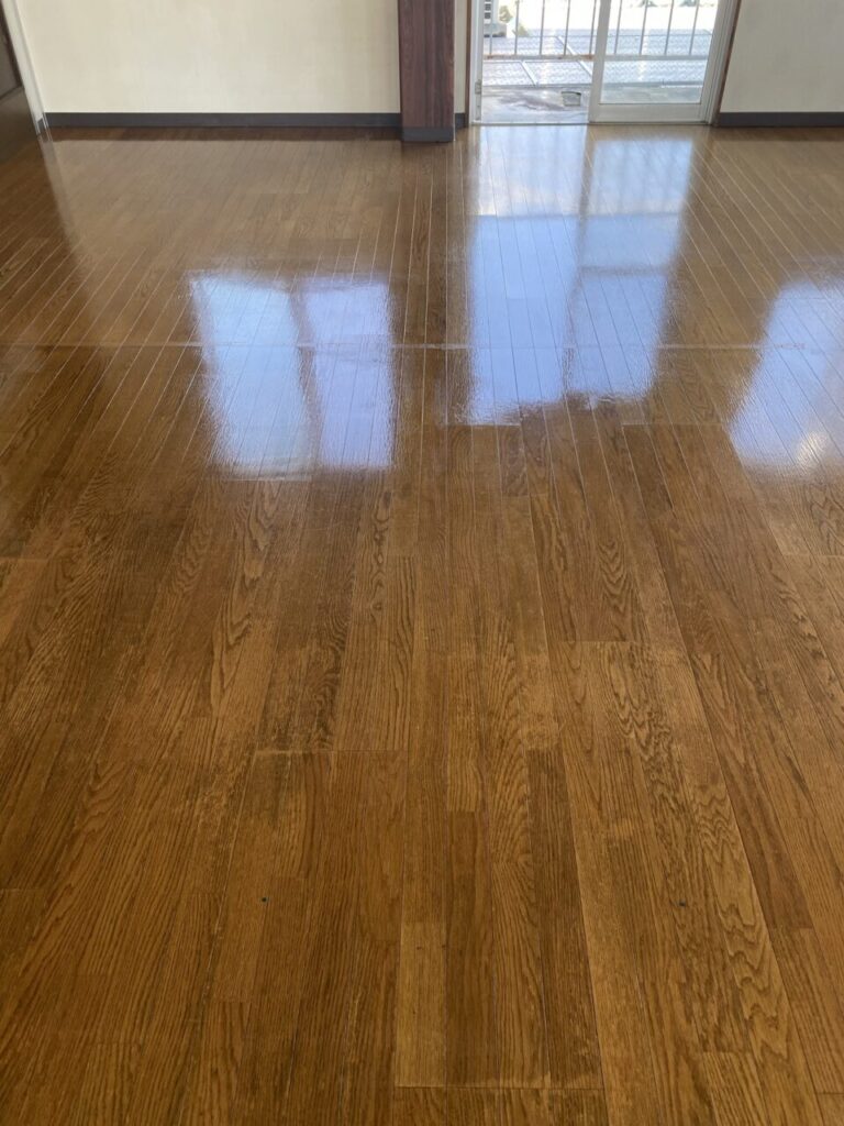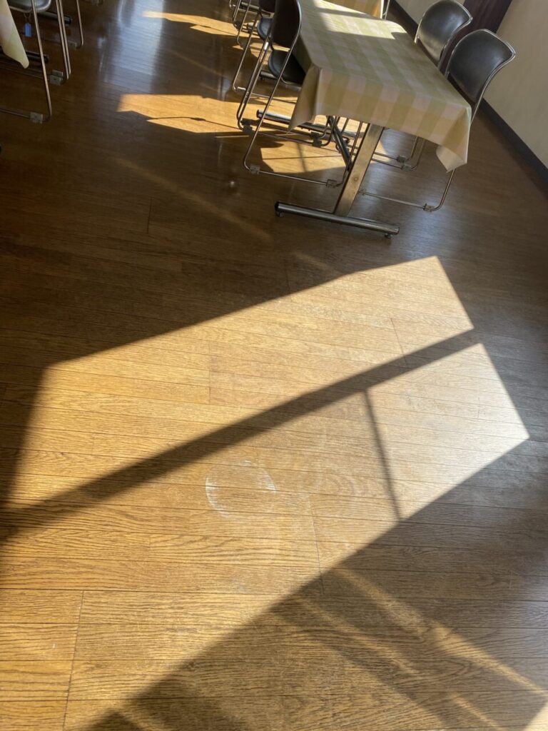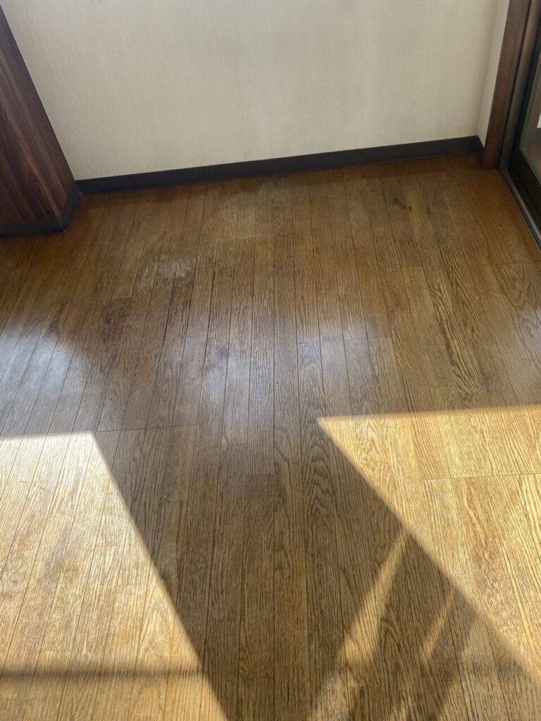 長年、日光が差し込む場所では床がだいぶ傷んでおり、ツヤも失われていましたが、丁寧に剥離を行ったうえで新しいワックスを塗布し、落ち着いた光沢を取り戻しました。