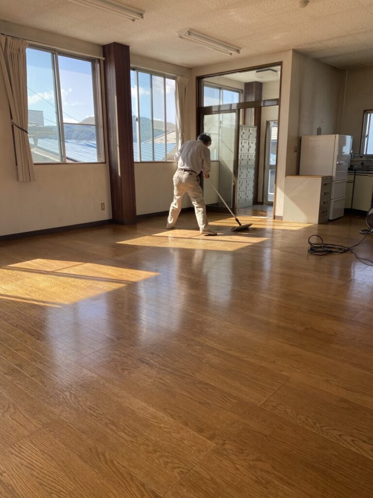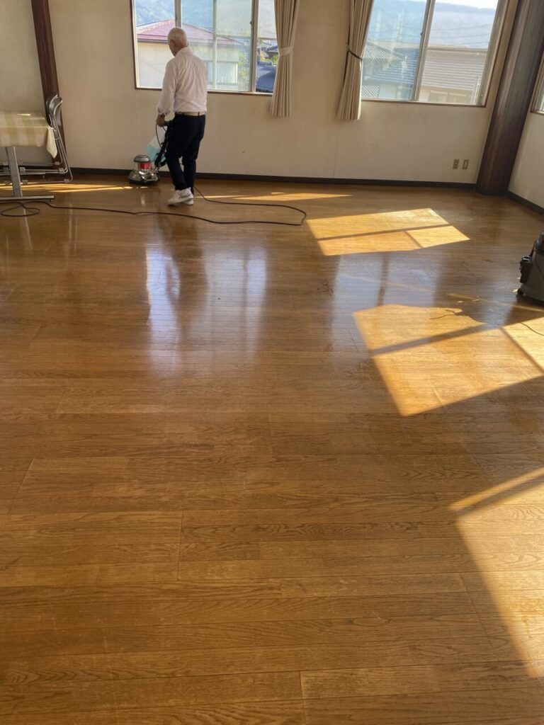 今回は、岡谷市にある工場の食堂の床で、古いワックスの剥離と新しいワックスの塗布作業を行いました。