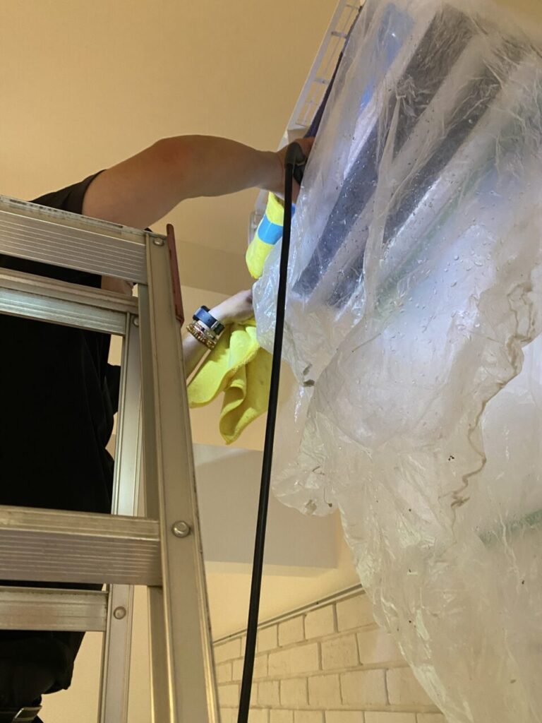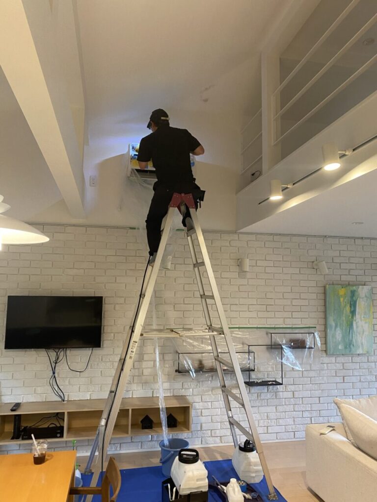 今回は、東急リゾートタウンにある施設のエアコン清掃を行いました。エアコンの設置位置が床から約2.5メートルと高所にあり、「手が届かず掃除できない」とのことで、当社にご依頼いただきました。
